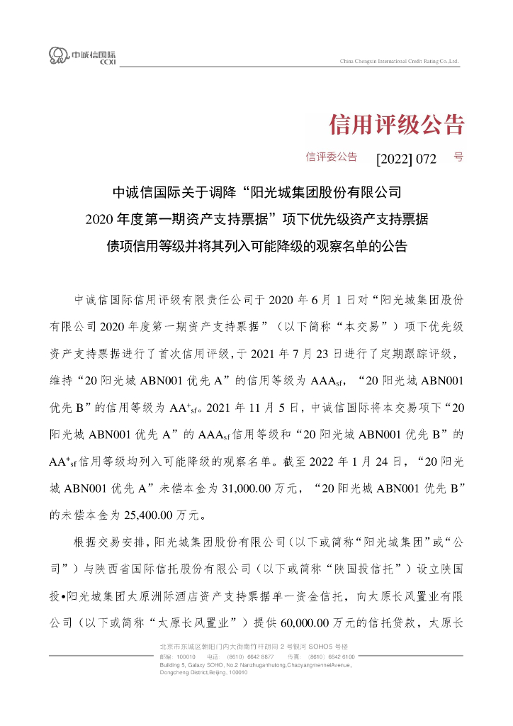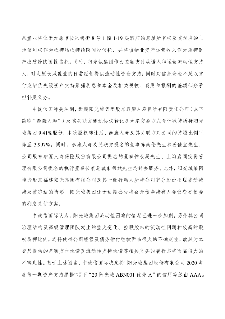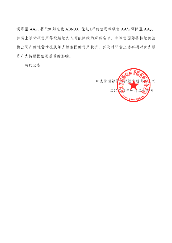 中诚信:中诚信国际关于调降“阳光城集团股份有限公司2020年度第一期资产支持票据”项下优先级资产支持票据债项信用等级并将其列入可能降级的观察名单的公告.pdf