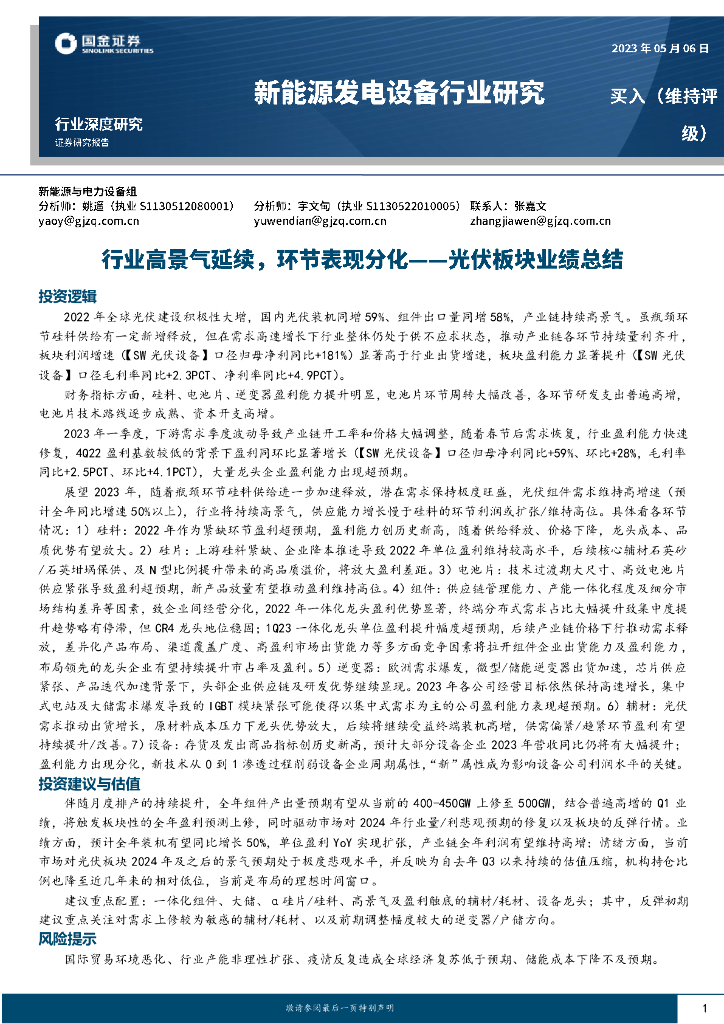 国金证券:新能源发电设备行业研究:光伏板块业绩总结-行业高景气延续,环节表现分化.pdf