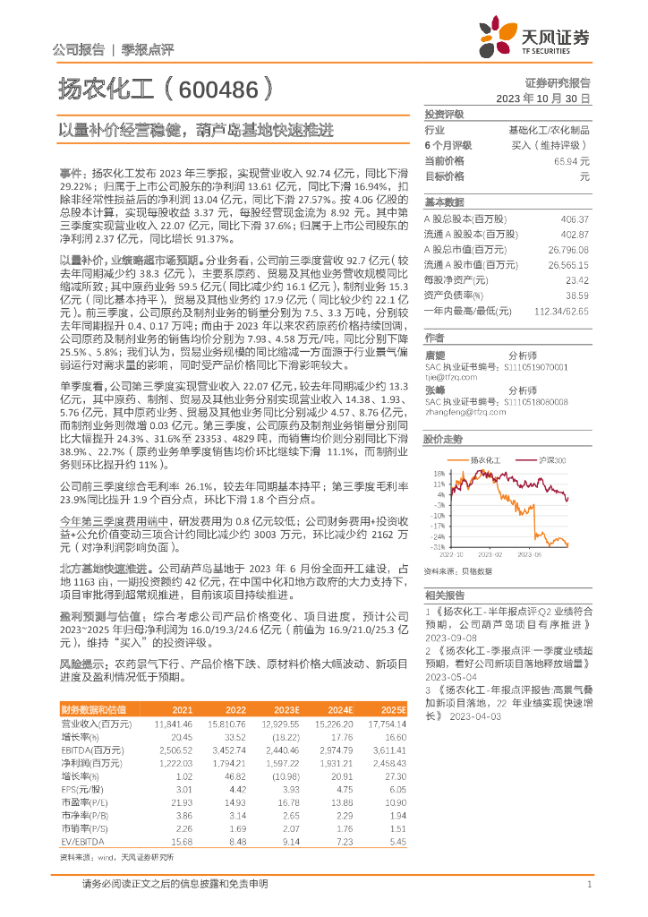 天风证券:扬农化工(600486)-以量补价经营稳健,葫芦岛基地快速推进.pdf