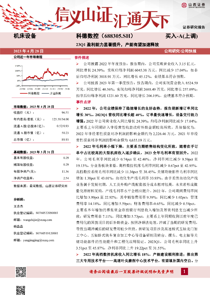 山西证券:科德数控(688305)-23Q1盈利能力显著提升,产能有望加速释放.pdf