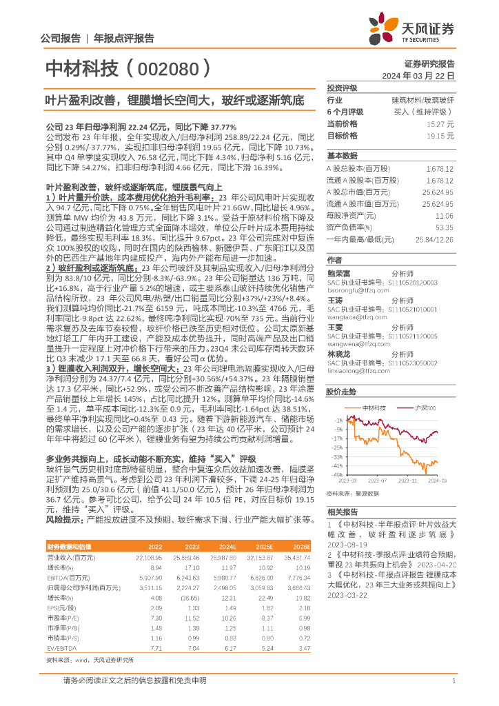 天风证券:中材科技(002080)-叶片盈利改善,锂膜增长空间大,玻纤或逐渐筑底.pdf