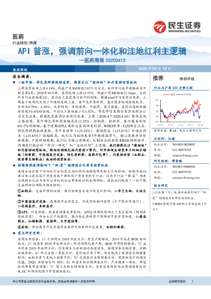 民生证券:医药周报:API普涨,强调前向一体化和洼地红利主逻辑.pdf