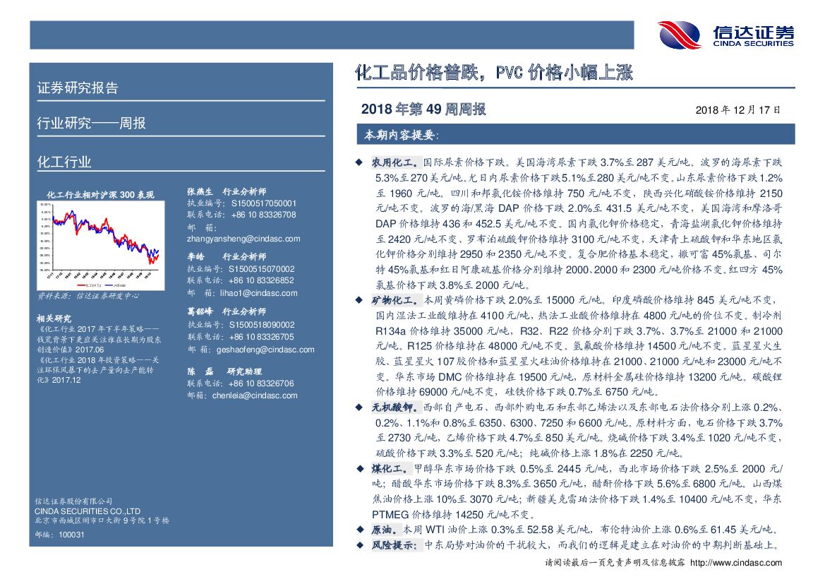 信达证券:化工行业2018年第49周周报:化工品价格普跌,PVC价格小幅上涨.pdf