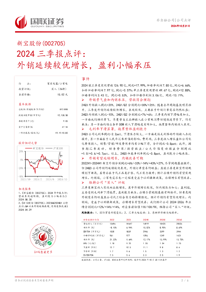 国联证券:新宝股份(002705)-2024三季报点评:外销延续较优增长,盈利小幅承压.pdf