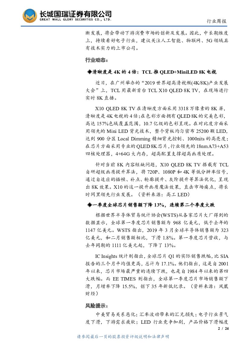长城国瑞证券:电子行业双周报2019年第9期(总第9期):电子产业下游需求放缓,需待新兴应用领域发展接力.pdf