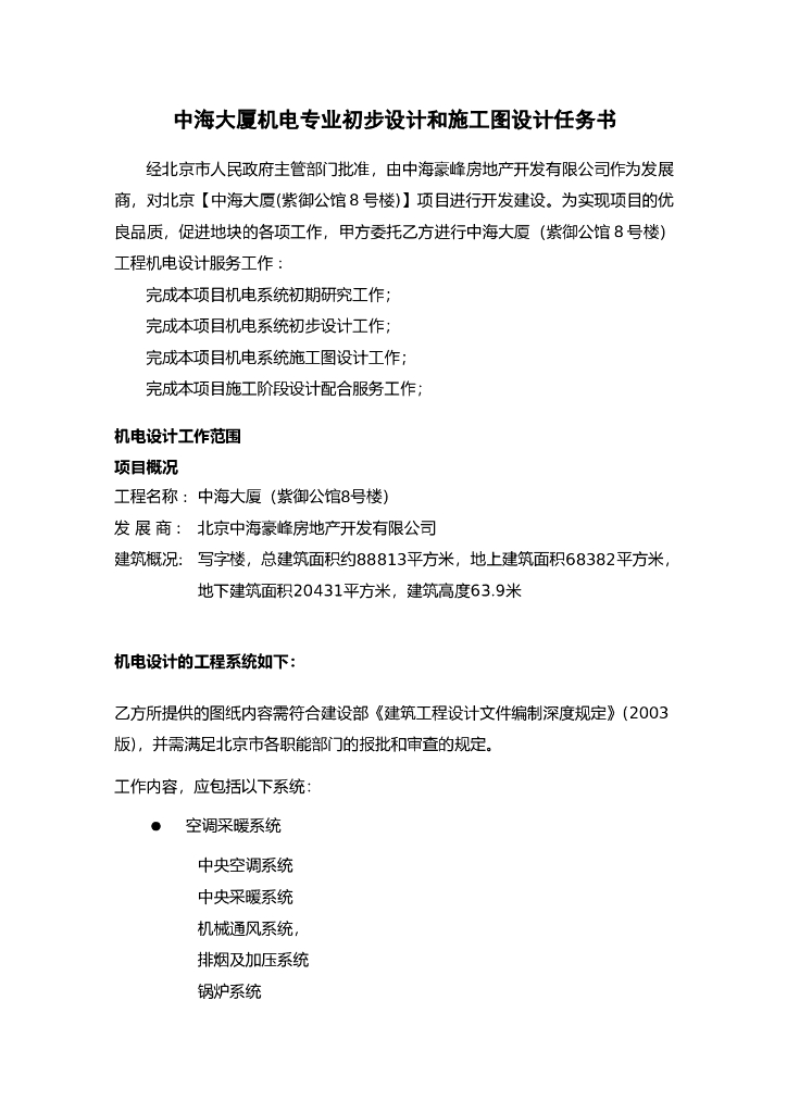 [知名地产地产]北京办公建筑机电专业初步设计和施工图设计任务书.doc