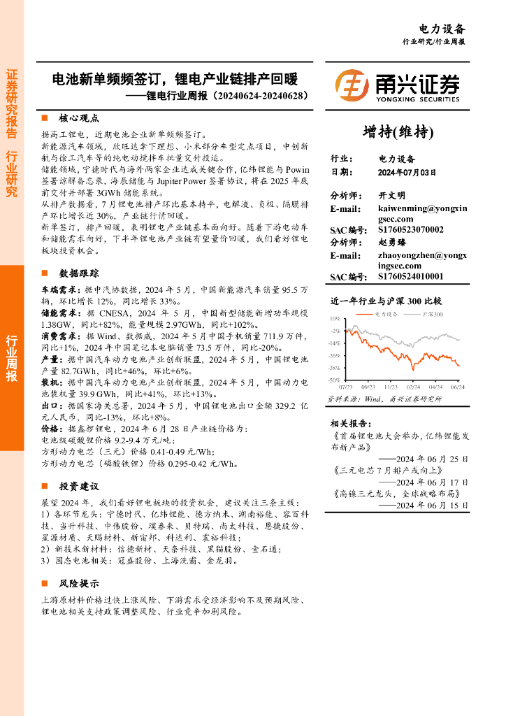 甬兴证券:锂电行业周报:电池新单频频签订,锂电产业链排产回暖.pdf