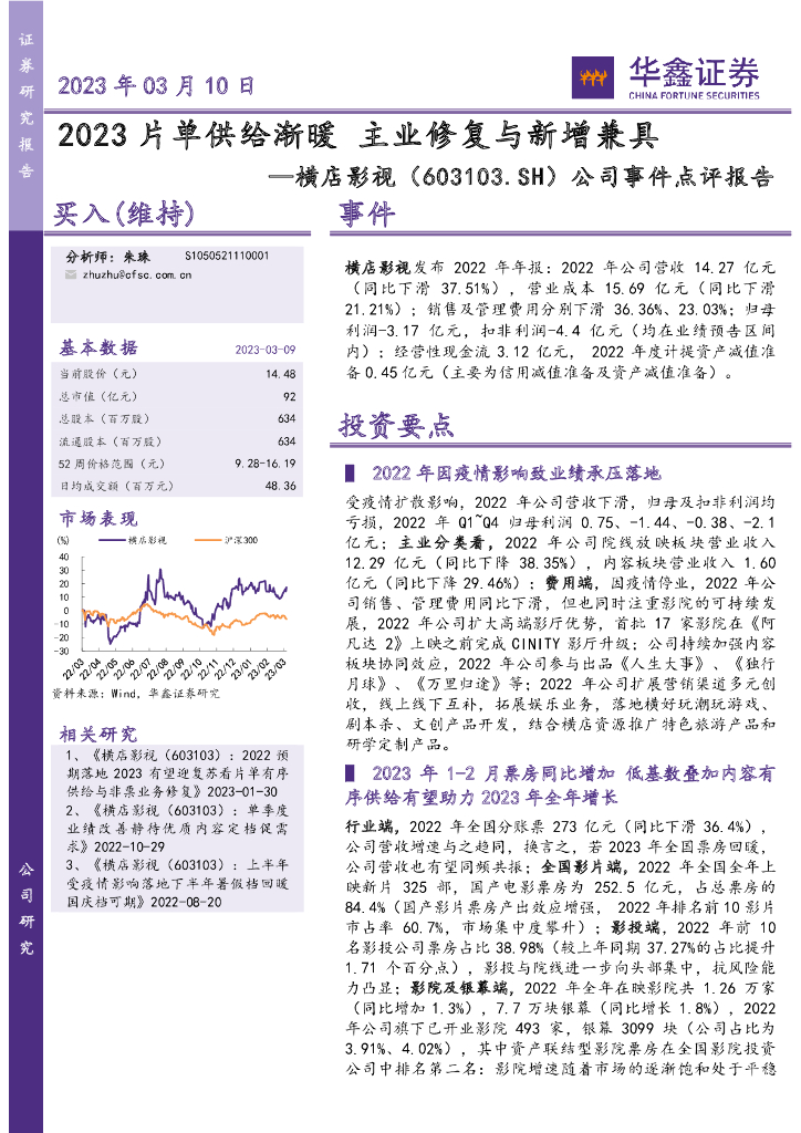 华鑫证券:横店影视(603103)-公司事件点评报告:2023片单供给渐暖 主业修复与新增兼具.pdf