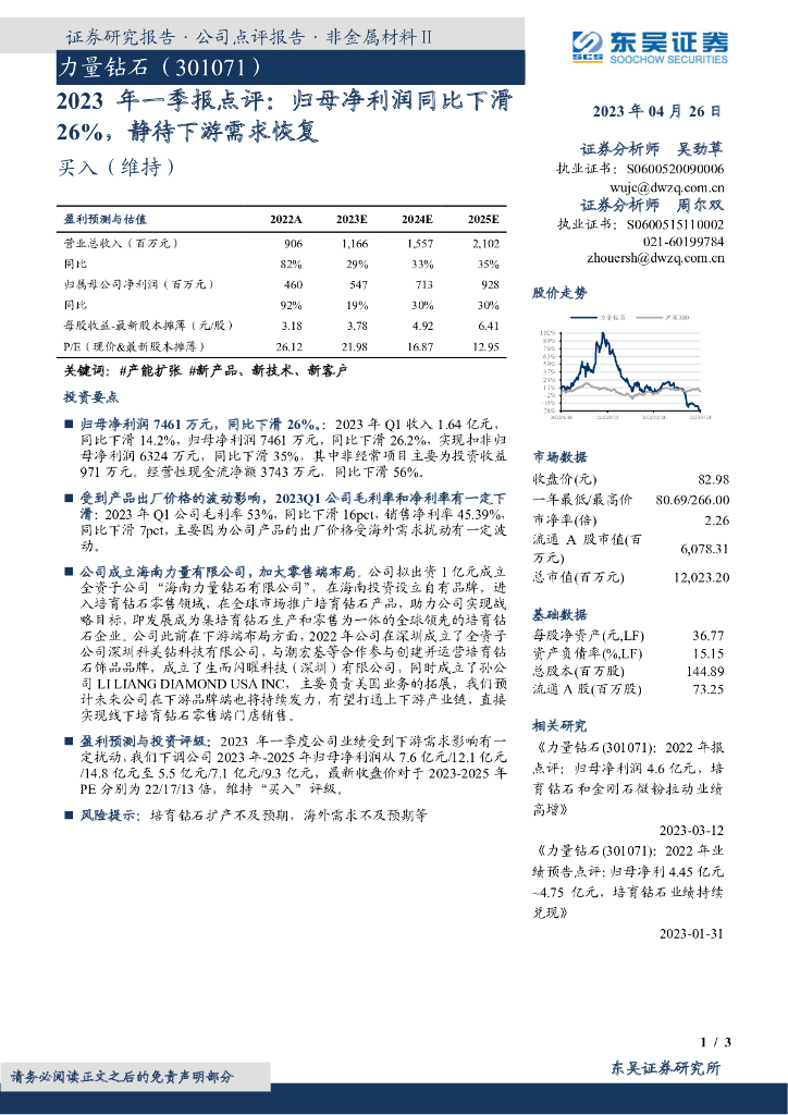 东吴证券:力量钻石(301071)-2023年一季报点评:归母净利润同比下滑26%,静待下游需求恢复.pdf