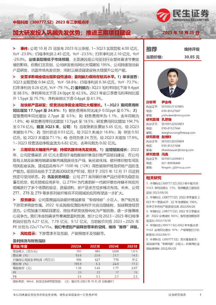 民生证券:中简科技(300777)-2023年三季报点评:加大研发投入巩固先发优势;推进三期项目建设.pdf