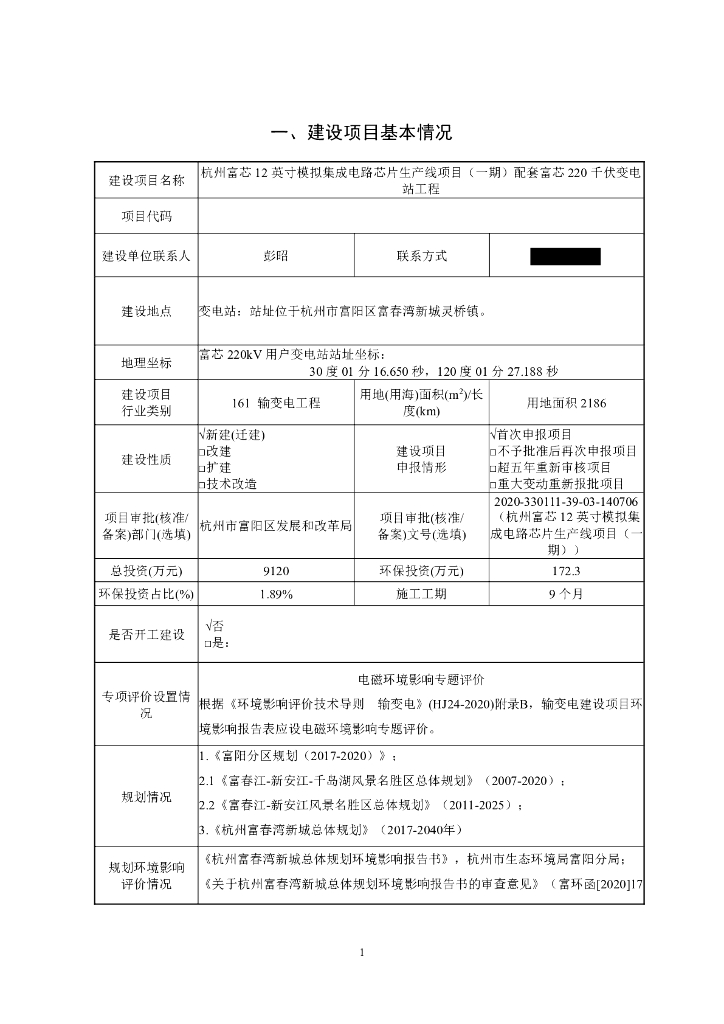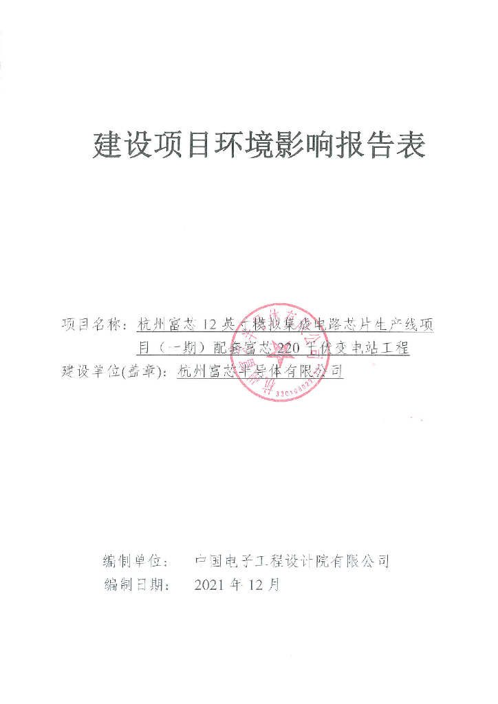 杭州富芯12英寸模拟集感电路芯片生产线项目(一期)配套富芯220平优变电站工程建设项目环境影响报告表.pdf