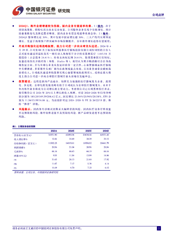 中国银河:迈瑞医疗(300760)-2023年年报及2024年一季报业绩点评:业绩符合预期,进一步向全球龙头迈进.pdf