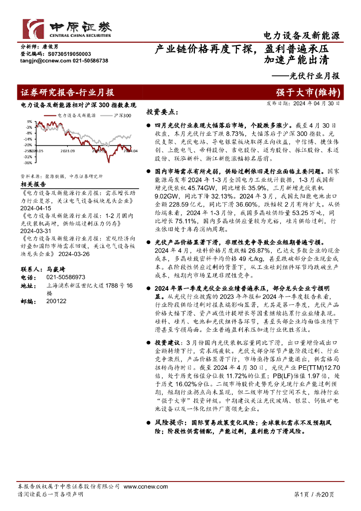 中原证券:光伏行业月报:产业链价格再度下探,盈利普遍承压加速产能出清.pdf