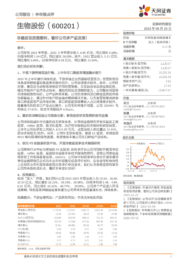 天风证券:生物股份(600201)-非瘟疫苗进展顺利,看好公司多产品发展!.pdf