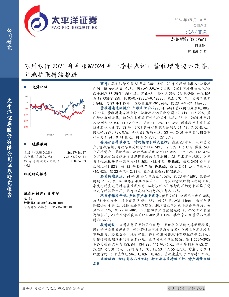 太平洋证券:苏州银行2023年年报&2024年一季报点评:营收增速边际改善,异地扩张持续推进.pdf