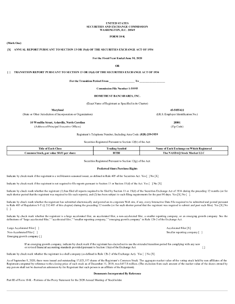Hometrust Bancshares Inc(HTBI)2020财年年度报告(英文版).pdf