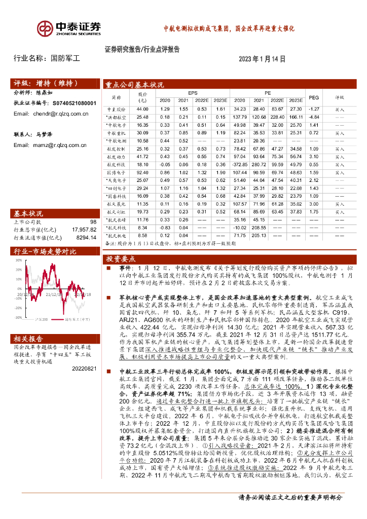 中泰证券:国防军工行业点评报告:中航电测拟收购成飞集团,国企改革再迎重大催化.pdf