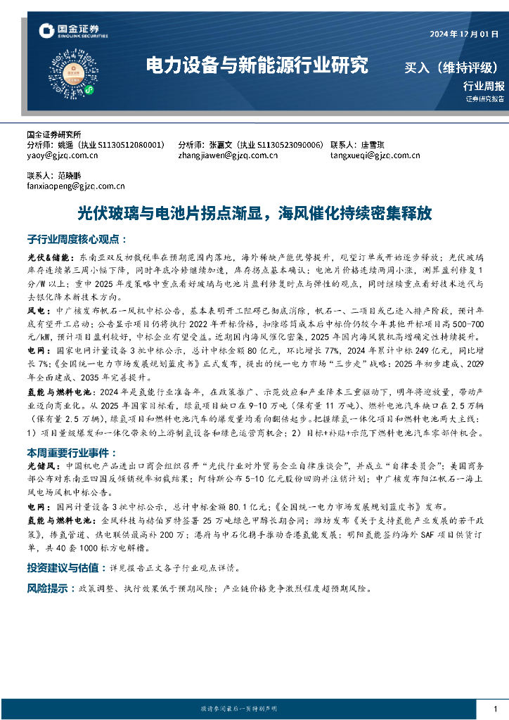 国金证券:电力设备与新能源行业研究:光伏玻璃与电池片拐点渐显,海风催化持续密集释放.pdf