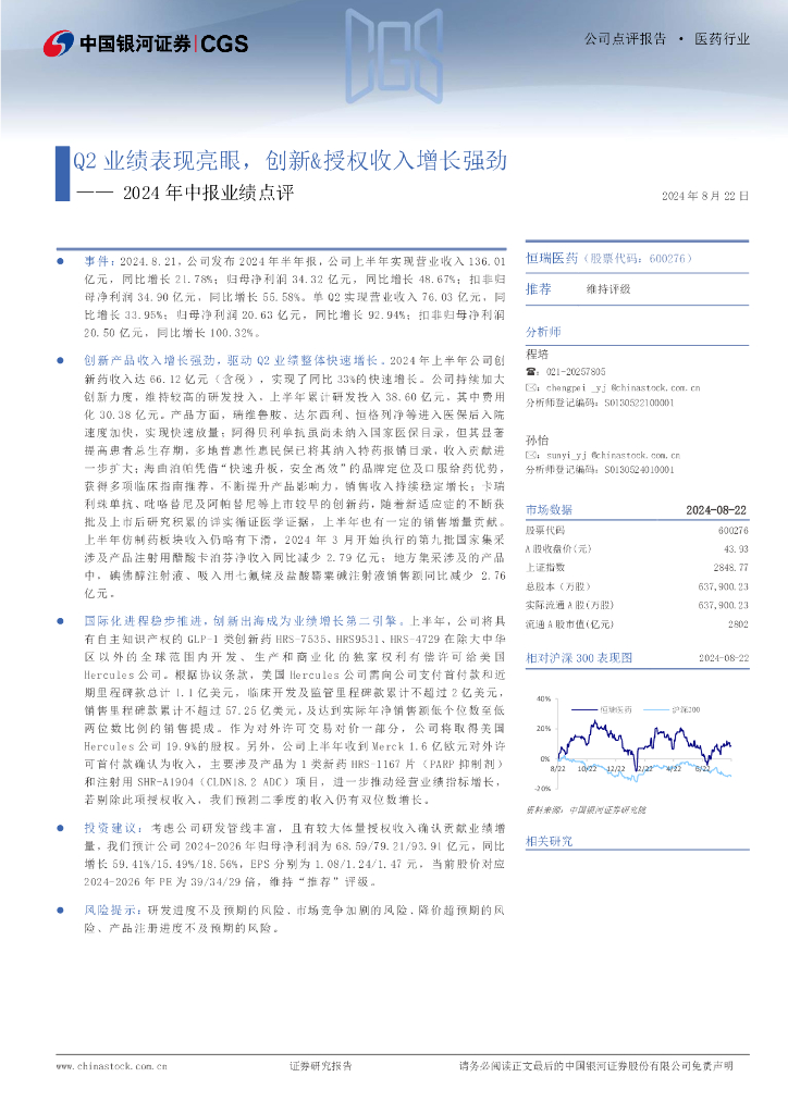 中国银河:恒瑞医药(600276)-2024年中报业绩点评:Q2业绩表现亮眼,创新&授权收入增长强劲.pdf
