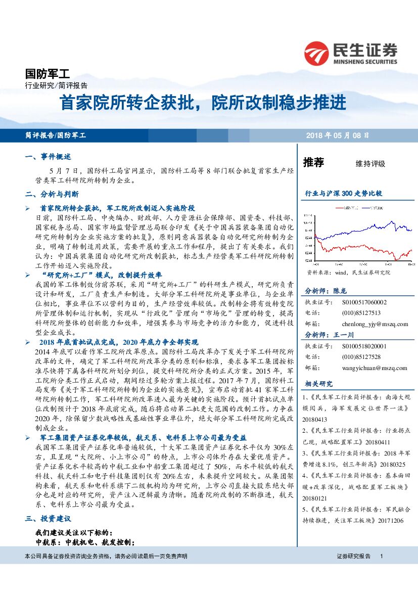 民生证券:国防军工简评报告:首家院所转企获批,院所改制稳步推进.pdf