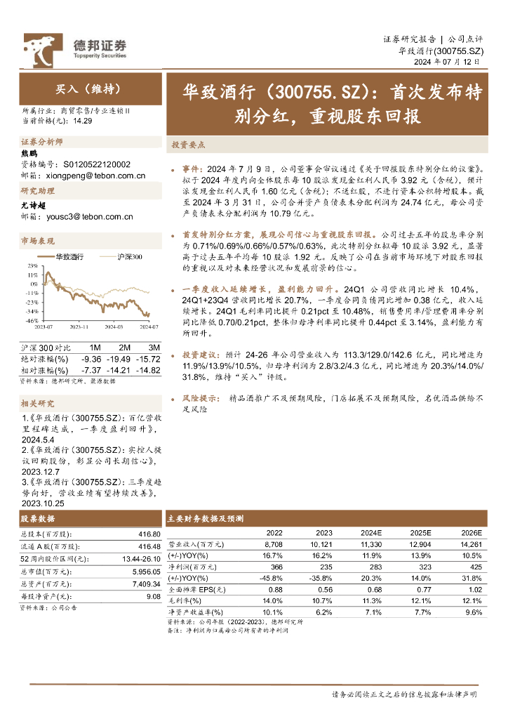 德邦证券:华致酒行(300755)-首次发布特别分红,重视股东回报.pdf