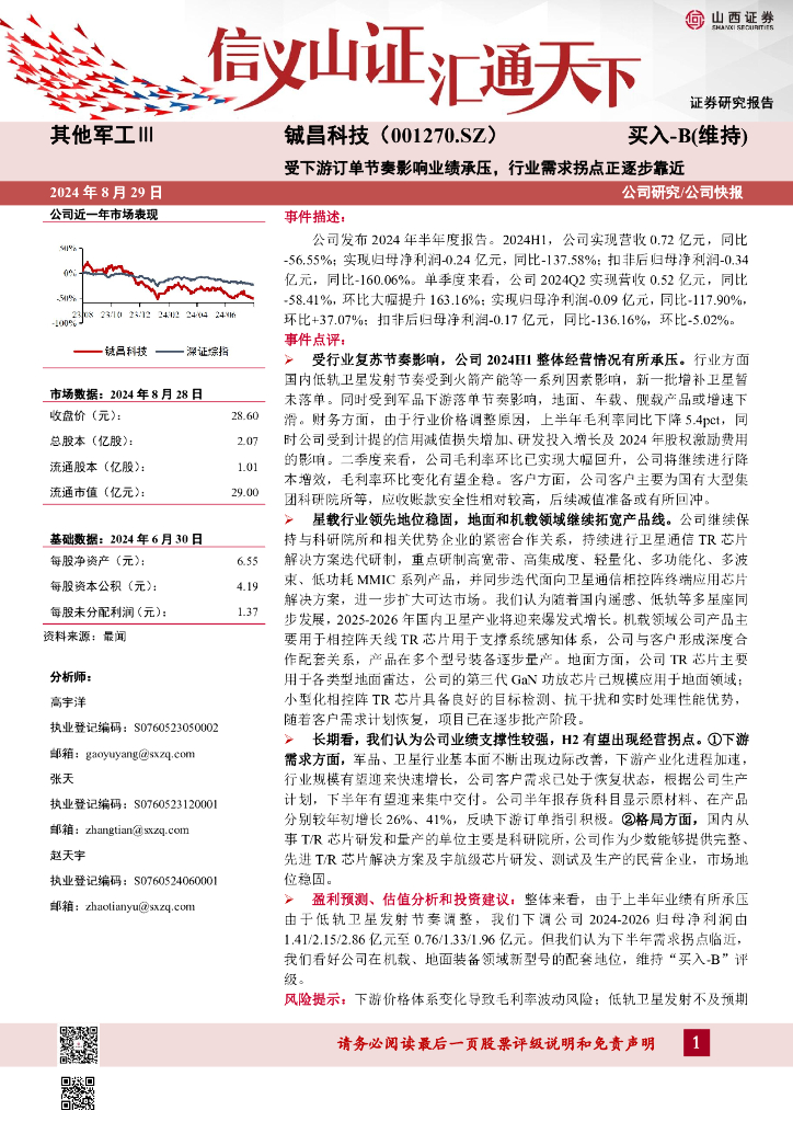 山西证券:铖昌科技(001270)-受下游订单节奏影响业绩承压,行业需求拐点正逐步靠近公司研究/公司快报.pdf