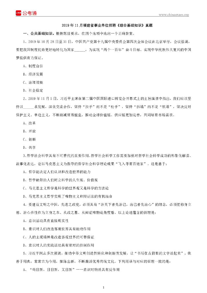 2019年11月福建省事业单位招聘《综合基础知识》真题.pdf