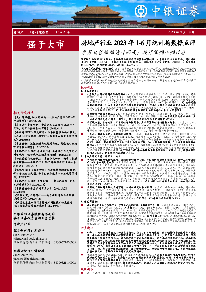 中银证券:房地产行业2023年1-6月统计局数据点评:单月销售降幅达近两成;投资降幅小幅改善.pdf