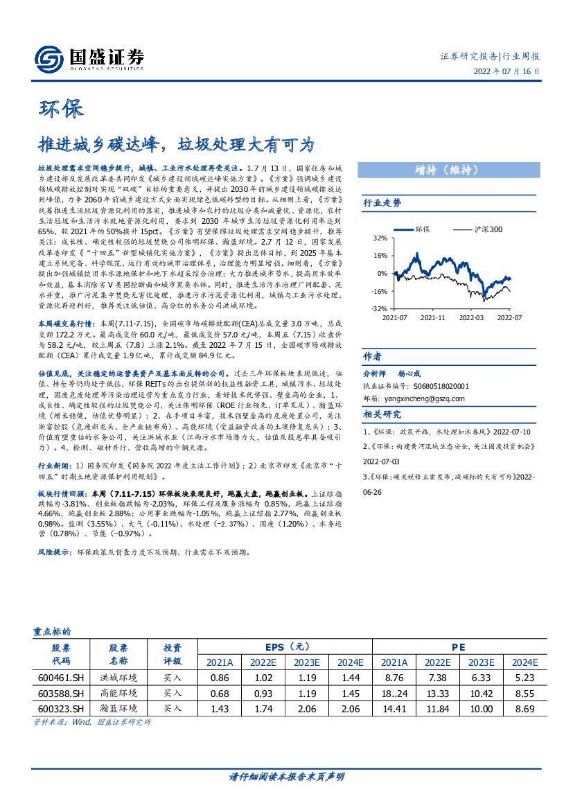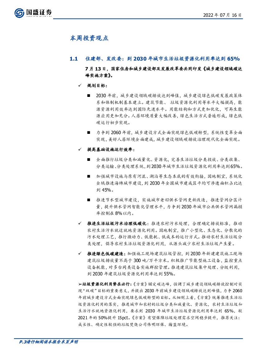 国盛证券:环保行业周报:推进城乡碳达峰,垃圾处理大有可为.pdf