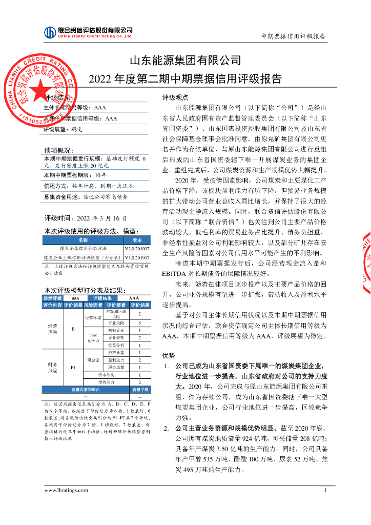 联合资信:山东能源集团有限公司2022年度第二期中期票据信用评级报告及跟踪评级安排.pdf