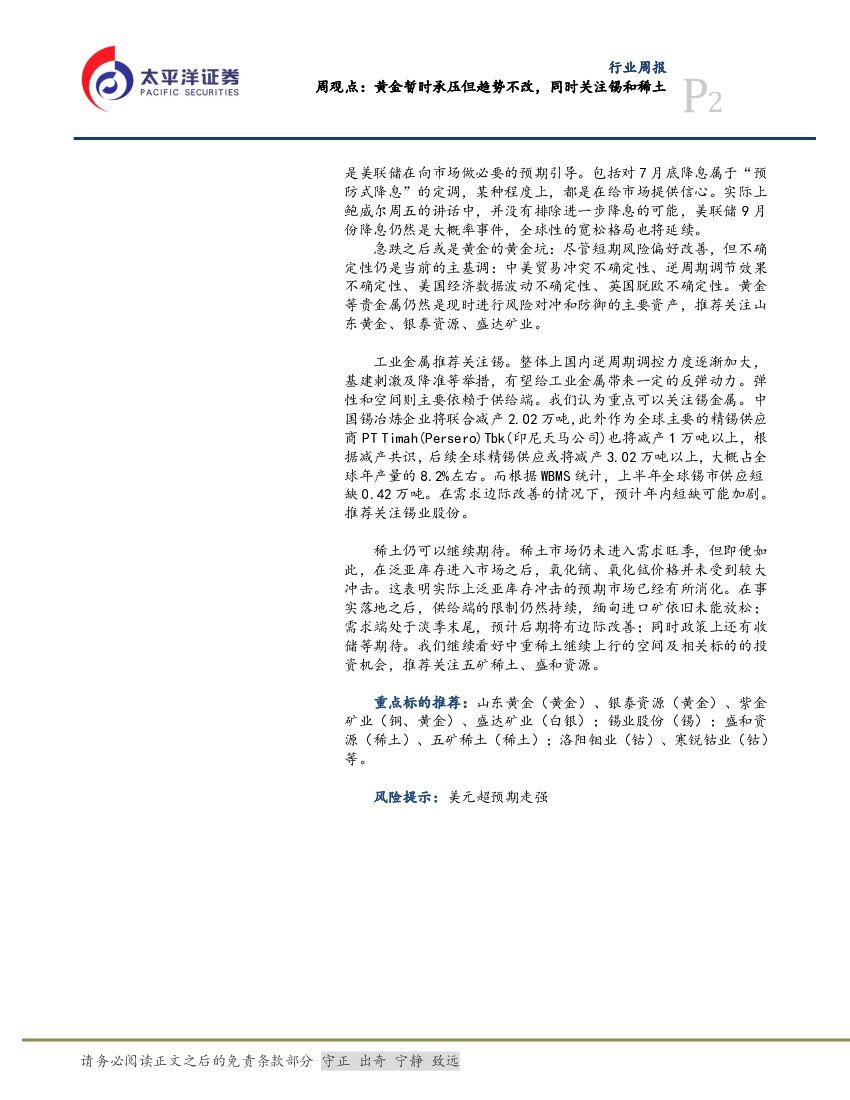 太平洋证券:金属、非金属与采矿行业周观点:黄金暂时承压但趋势不改,同时关注锡和稀土.pdf