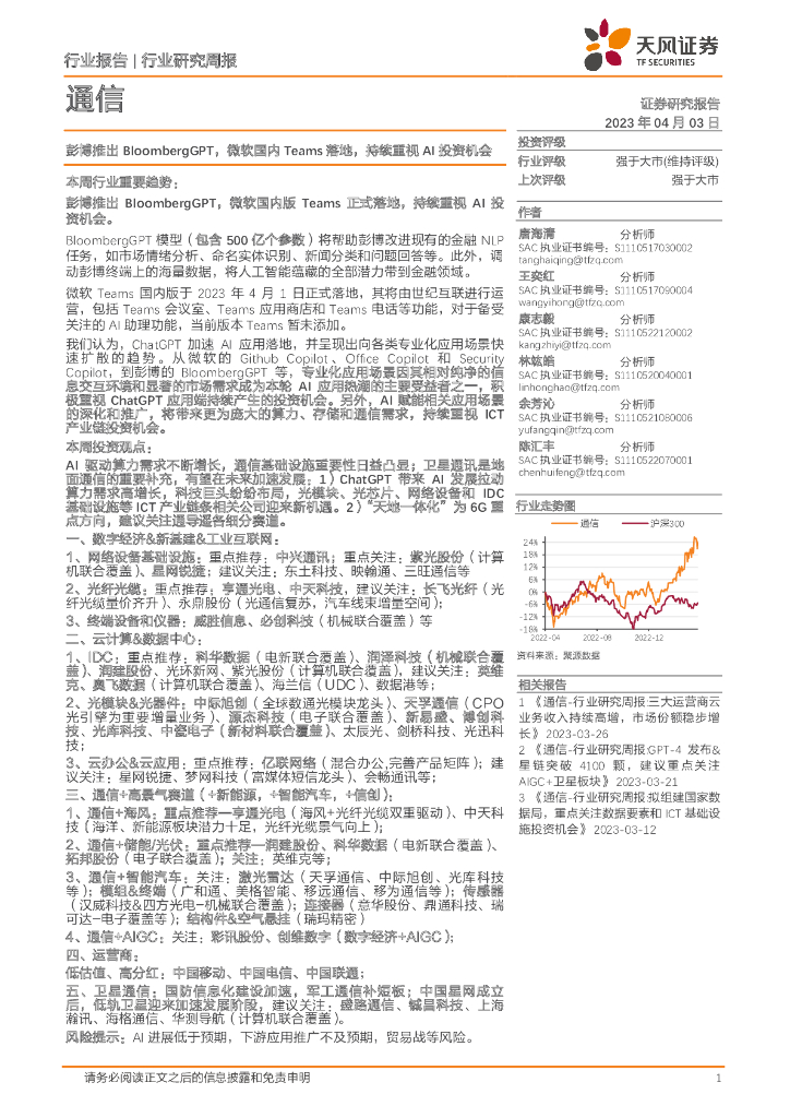 天风证券:通信行业研究周报:彭博推出BloombergGPT,微软国内Teams落地,持续重视AI投资机会.pdf
