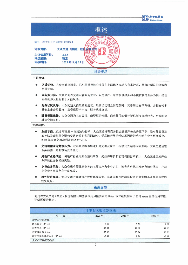 新世纪:大众交通(集团)股份有限公司2023年信用评级报告.pdf