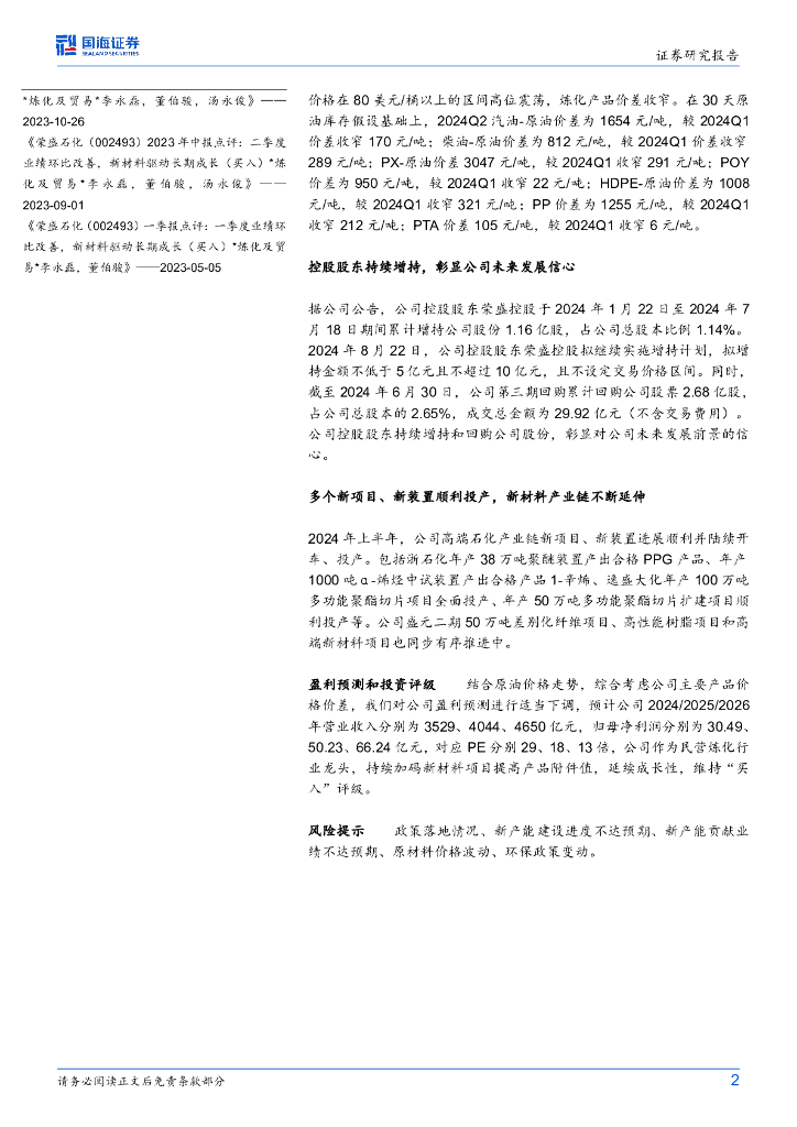 国海证券:荣盛石化(002493)-2024年中报点评:2024H1同比扭亏为盈,控股股东增持彰显发展信心.pdf