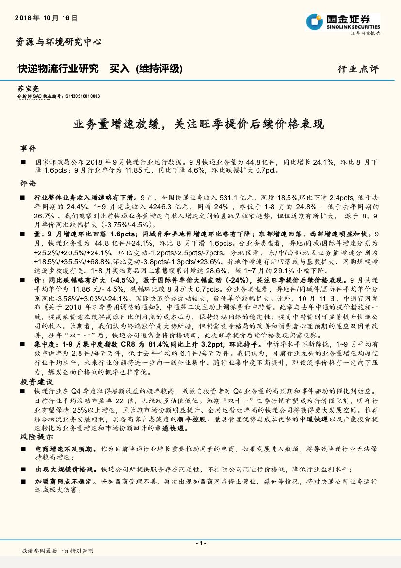 国金证券:快递物流行业研究:业务量增速放缓,关注旺季提价后续价格表现.pdf