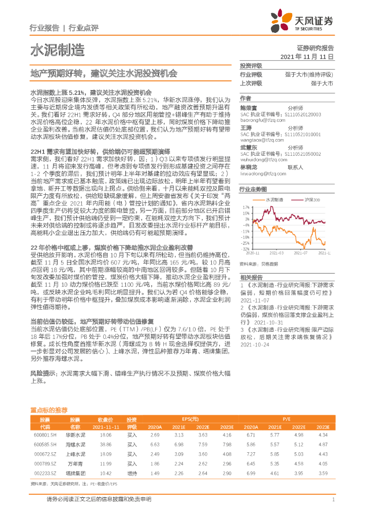 天风证券:水泥制造:地产预期好转,建议关注水泥投资机会.pdf