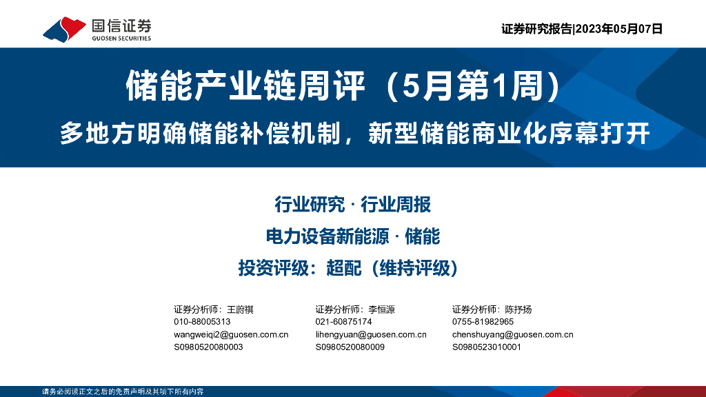 国信证券:储能产业链周评(5月第1周):多地方明确储能补偿机制,新型储能商业化序幕打开.pdf