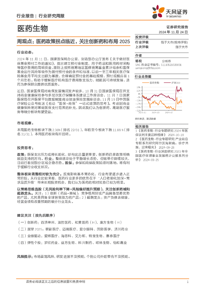 天风证券:医药生物行业周观点:医药政策拐点临近,关注创新药和布局2025.pdf