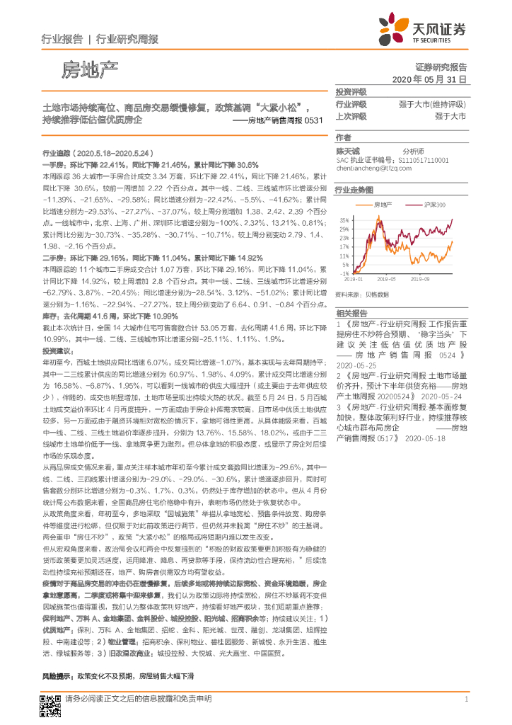 天风证券:房地产销售周报:土地市场持续高位、商品房交易缓慢修复,政策基调“大紧小松”,持续推荐低估值优质房企.pdf