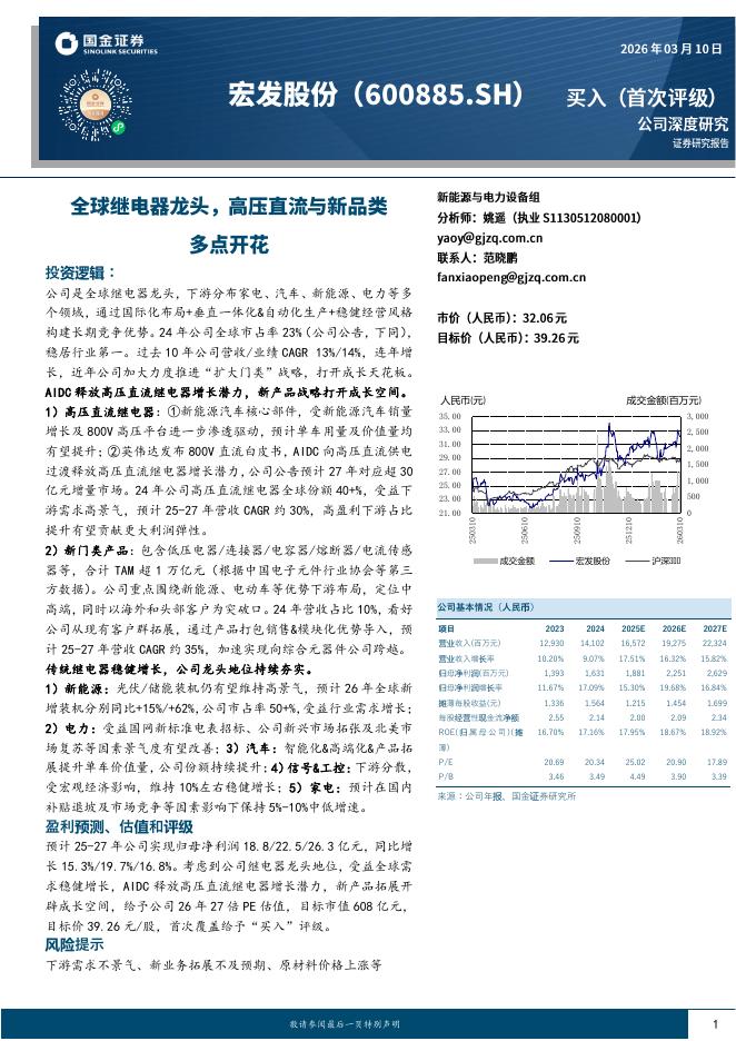 国金证券:宏发股份(600885)-全球继电器龙头,高压直流与新品类多点开花.pdf