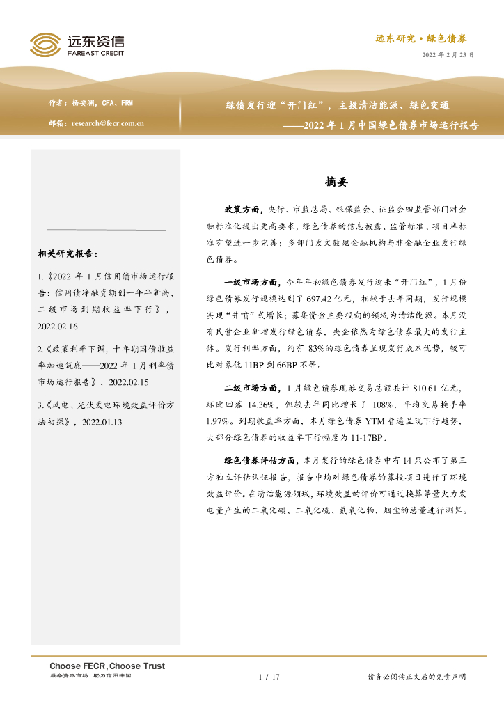 远东资信:绿债发行迎开门红,主投清洁能源、绿色交通——2022年1月中国绿色债券市场运行报告.pdf