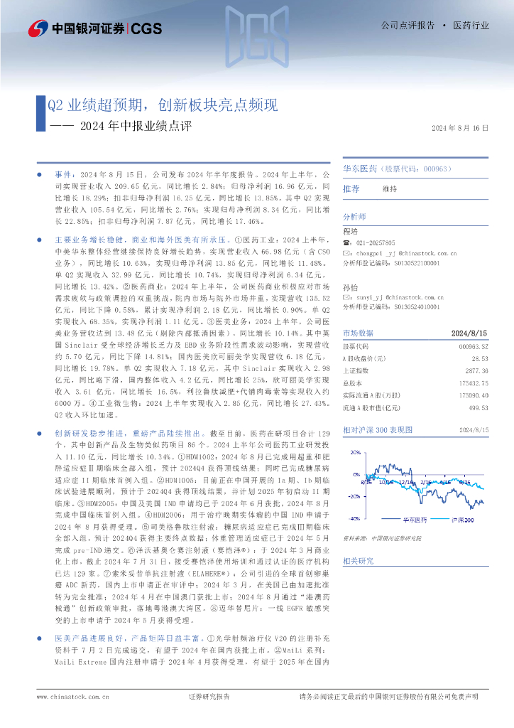 中国银河:华东医药(000963)-2024年中报业绩点评:Q2业绩超预期,创新板块亮点频现.pdf