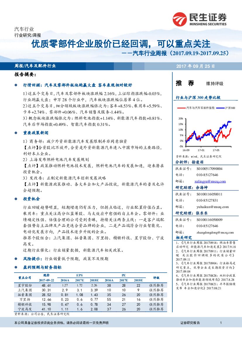 民生证券:汽车行业周报:优质零部件企业股价已经回调,可以重点关注.pdf