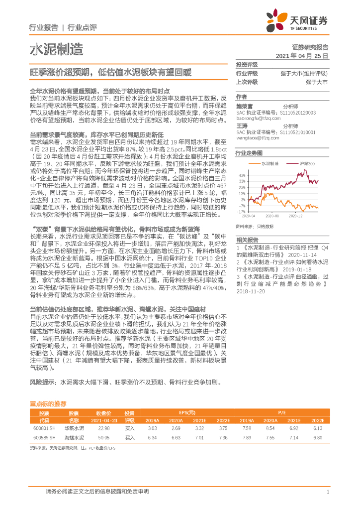 天风证券:水泥制造:旺季涨价超预期,低估值水泥板块有望回暖.pdf