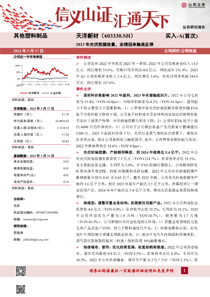 山西证券:_其他塑料制品_天洋新材年报及一季报点评--2023年光伏胶膜放量,业绩迎来.pdf
