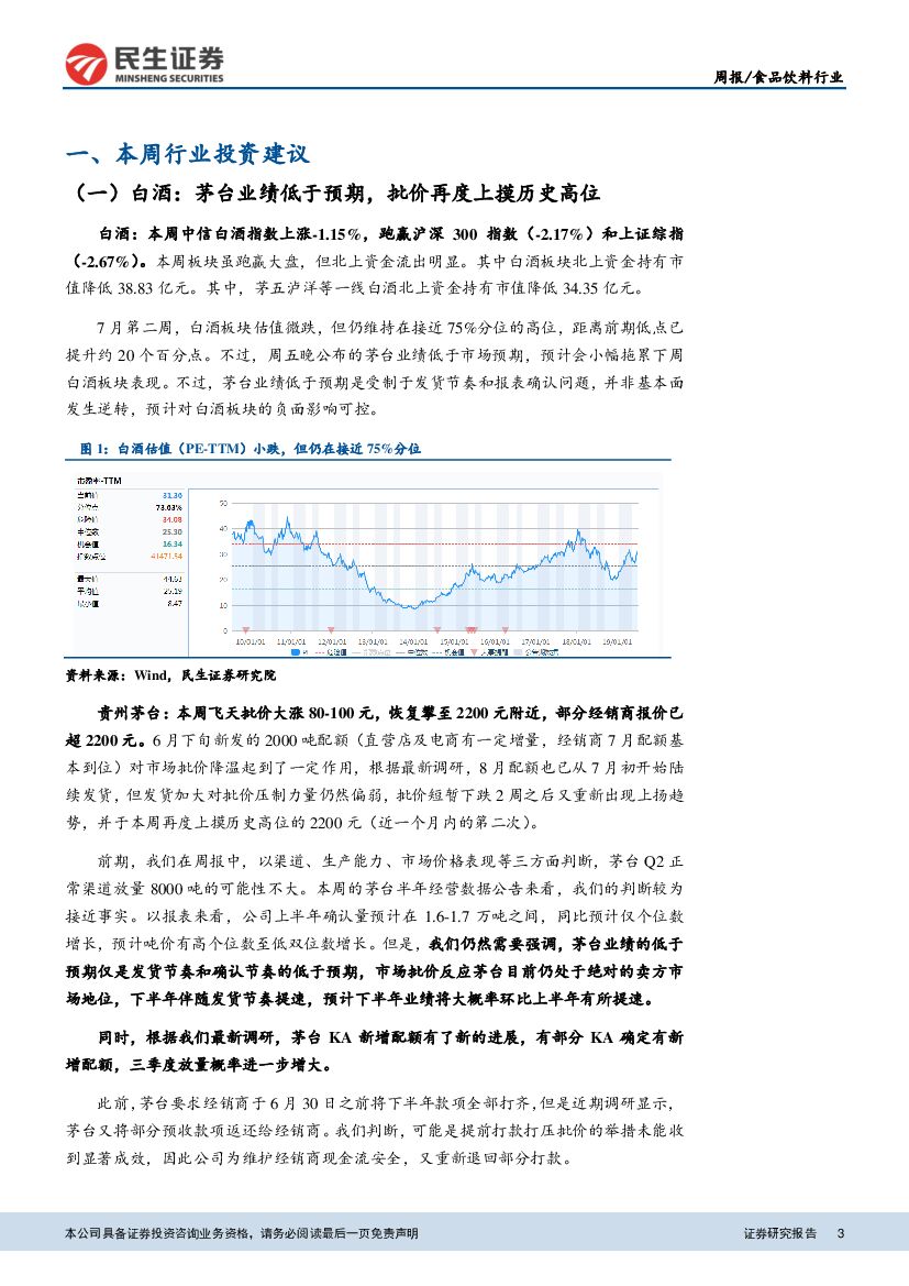 民生证券:食品饮料行业周报:茅台业绩低于预期,飞天批价再度上摸历史高位.pdf