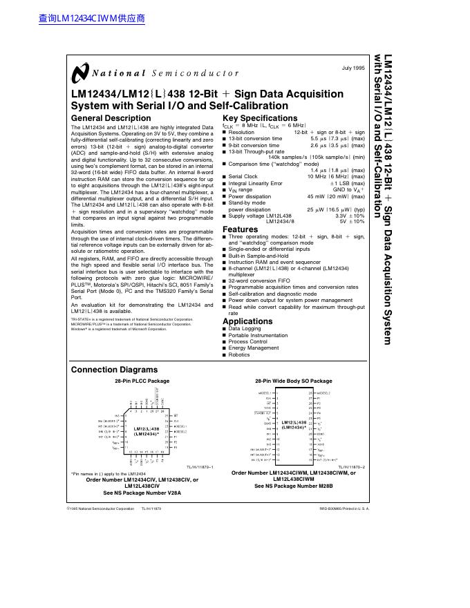 National Semiconductor LM12434/LM12ÀLÓ438 12-Bit a Sign Data Acquisition System with Serial I/O and Self-Calibration 数据手册.pdf