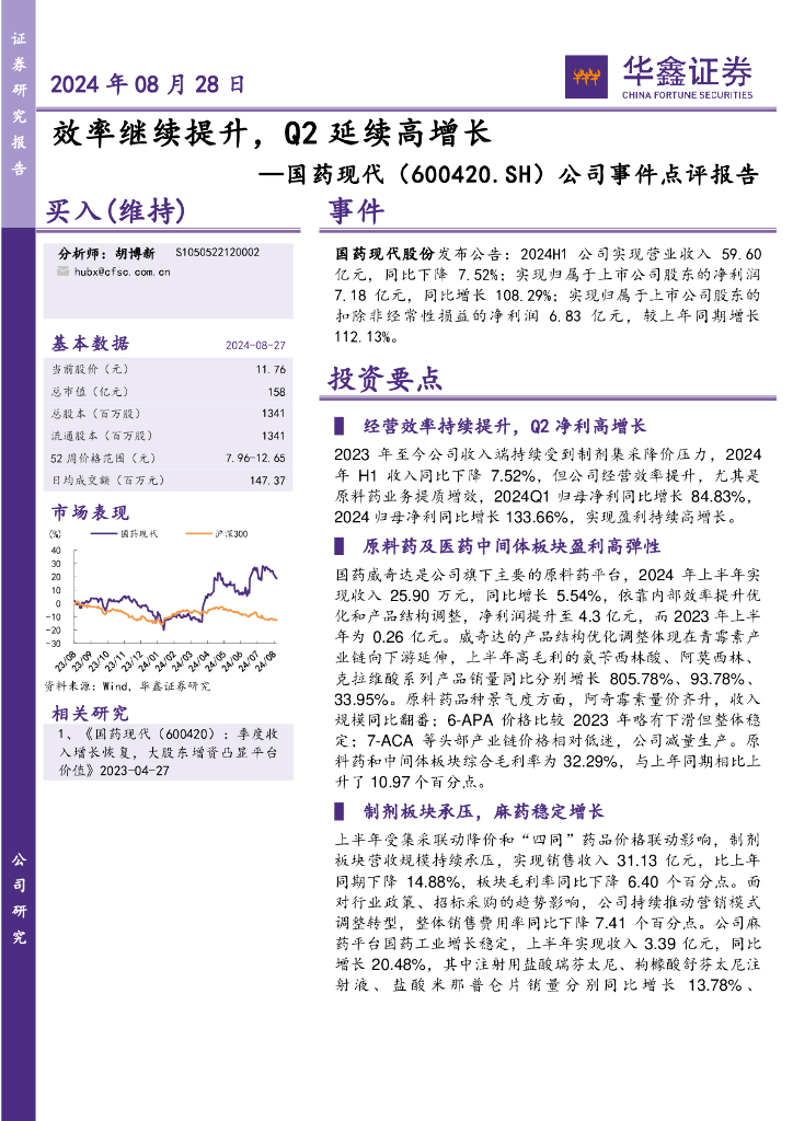 华鑫证券:国药现代(600420)-公司事件点评报告:效率继续提升,Q2延续高增长.pdf