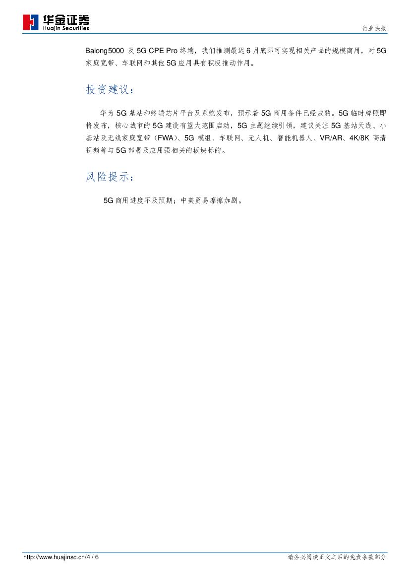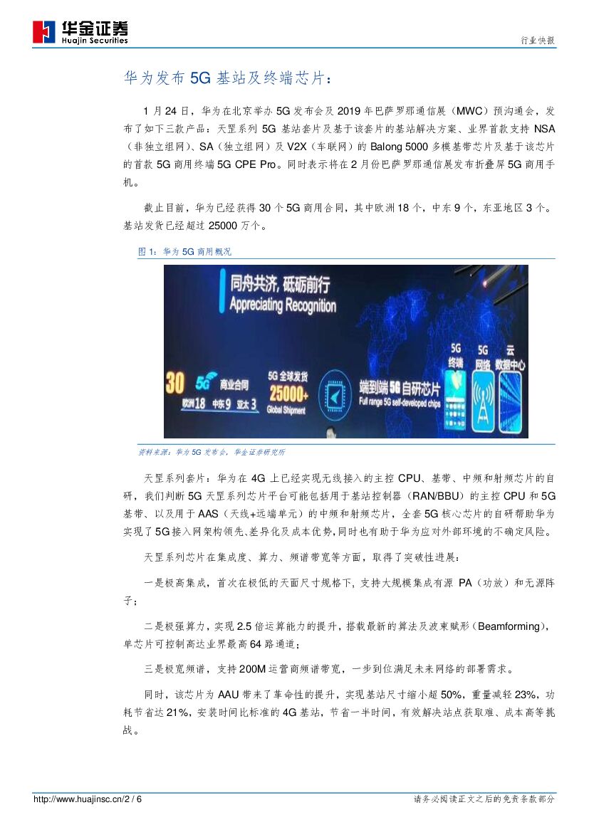 华金证券:通信行业快报:华为发布5G基站及终端芯片,加速5G商用进程.pdf