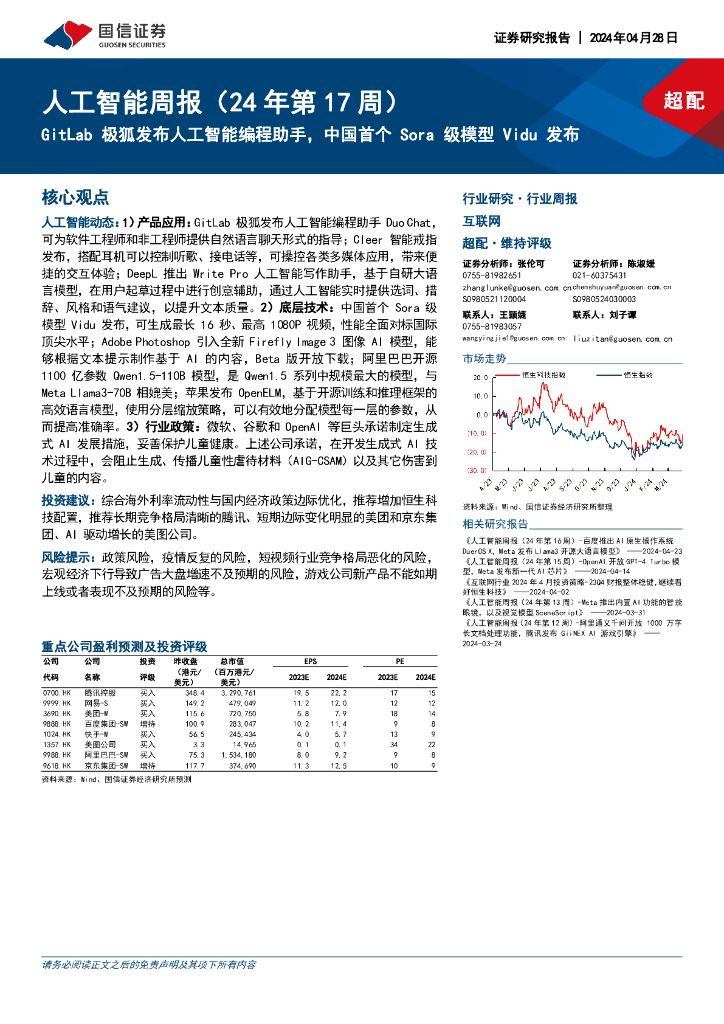 国信证券:人工智能周报(24年第17周):GitLab极狐发布人工智能编程助手,中国首个Sora级模型Vidu发布.pdf